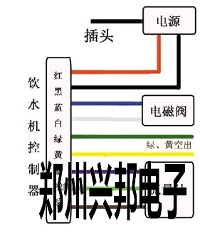 紅線----->12V電源正極,黑線----->12V電源負(fù)極,藍(lán)線----->電磁閥一端,白線----->電磁閥另一端,綠線、黃線空出,紫線----->流量計(jì)負(fù)極,淺綠線----->流量計(jì)信號(hào)線,棕線----->流量計(jì)正極。