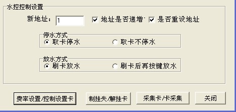 2   水控控制設置:新地址設置為1,把地址號是否遞增和是否重設機器號前面的選項選上,如下圖所示,點擊費率設置|控制設置卡按鈕,點擊控制設置卡, 即可成功制作成控制設置卡去修改聯(lián)網(wǎng)型水控一體機的機器號??刂圃O置卡在機器上數(shù)卡成功時會提示8 OK  9 OK  10 OK