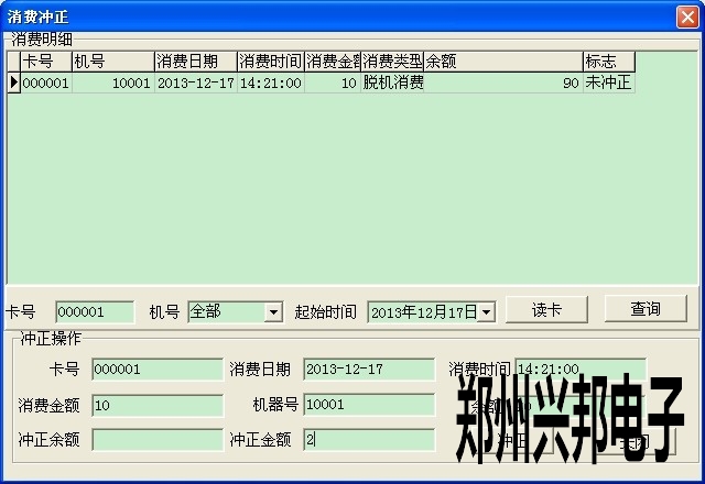 3. 點(diǎn)卡管理--消費(fèi)沖正,此時(shí)把多消費(fèi)的那張卡放到讀卡器上,然后點(diǎn)讀卡,此時(shí)會(huì)出現(xiàn)這天這張卡所有的消費(fèi)記錄,找到消費(fèi)多扣的那筆記錄,然后雙擊那筆記錄,此時(shí)下面就會(huì)出現(xiàn)這筆記錄的信息,然后把多消費(fèi)的金額在沖正金額那輸入即可。(如我這筆消費(fèi)記錄應(yīng)該是8元,但是按錯(cuò)了按成10元,此時(shí)我可以沖正2元)