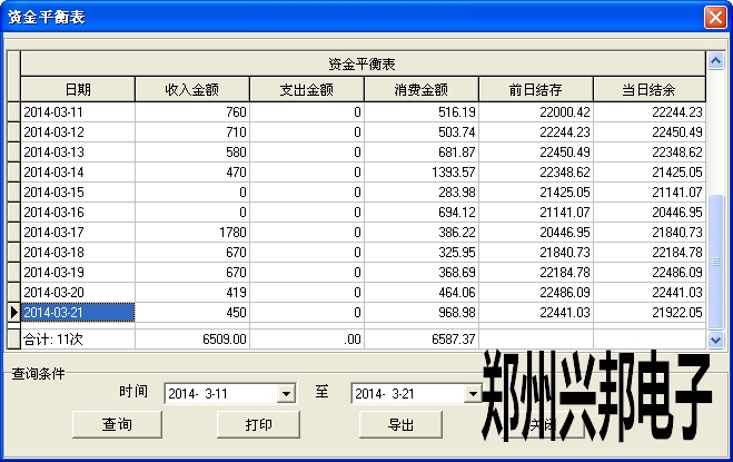485軟件中資金平衡表是查詢指定日期的賬目情況,包括收入、支出、消費和結(jié)余,統(tǒng)計時是按天統(tǒng)計的,顯示時也是按天顯示,一天一行,每一天都一個結(jié)存,當日結(jié)余=收入金額-支出金額-消費金額+前日結(jié)存,收入是指出納員每天的存款、收取的卡本金等,支出是指取款、退還卡本金、收繳舊卡的退款等,消費金額是指每天的消費總額,前日結(jié)存是指前一天的結(jié)余,每天的賬都是互相關聯(lián)的,若有一天的賬目不對,會影響到以后的所有賬目,所以在結(jié)賬前要求必須將所有消費數(shù)據(jù)都采集完畢。