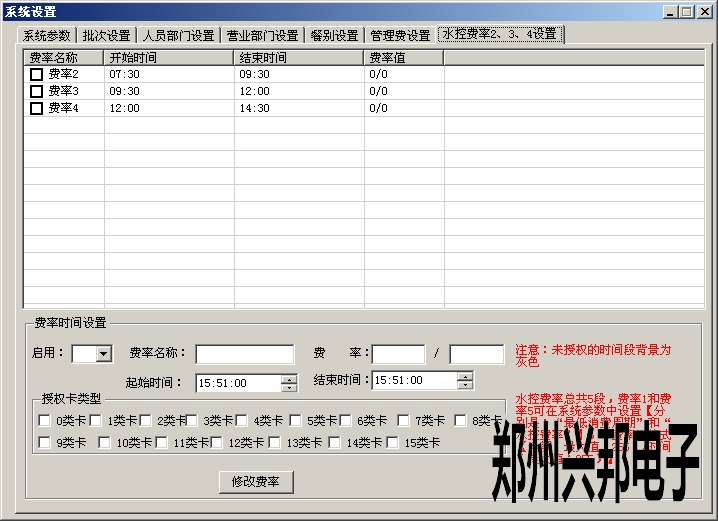 2、設置幾點到幾點之音流多長時間扣多少錢,在管理中心-系統(tǒng)設置-水控費率2、3、4設置里面設置時間,費率。
