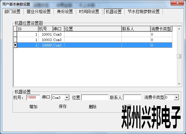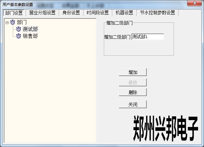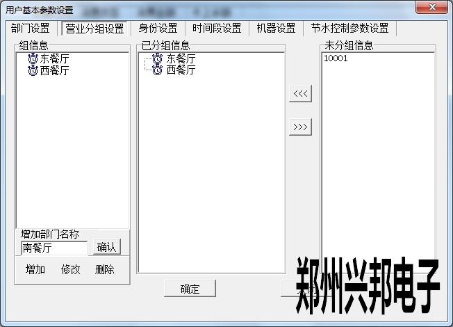 在使用興邦一卡通平臺(tái)用戶基本參數(shù)設(shè)置中有部門設(shè)置、營(yíng)業(yè)分組設(shè)置、身份設(shè)置、時(shí)間段設(shè)置、機(jī)器設(shè)置、節(jié)水控制參數(shù)設(shè)置。下面依次為其說(shuō)明。