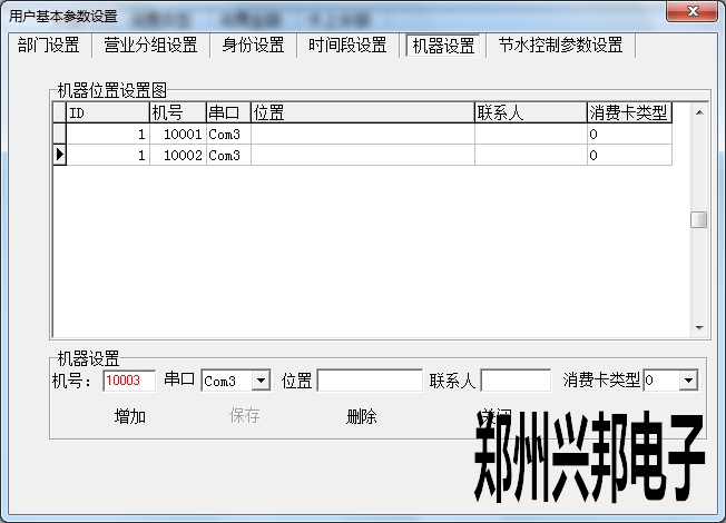 在機(jī)器設(shè)置中可以添加機(jī)器,設(shè)置機(jī)器號(hào)、串口以及消費(fèi)卡類型,位置、聯(lián)系人可以選填。其中設(shè)置機(jī)器號(hào)必須輸入5位,開(kāi)頭為1,最大可設(shè)置為19999.串口是指通訊器連接電腦的端口號(hào),此處的串口號(hào)選擇不正確的話會(huì)導(dǎo)致機(jī)器不通訊。