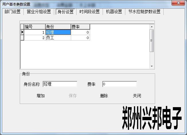 身份設(shè)置是對(duì)持卡人身份的說(shuō)明,通過(guò)讀卡可以看到此人的身份。直接輸入身份名稱,費(fèi)率填寫0,暫不起作用,點(diǎn)擊增加,增加成功后,選中信息進(jìn)行雙擊可以對(duì)身份名稱進(jìn)行修改,也可以刪除。