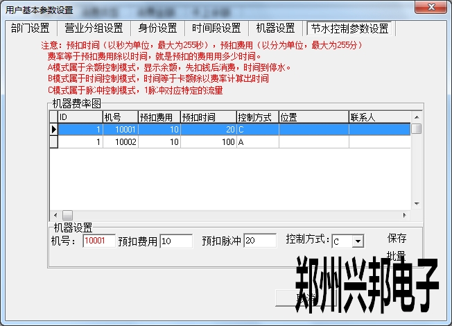 此參數(shù)設(shè)置是針對(duì)水控機(jī)上費(fèi)率三種模式的設(shè)置,可以對(duì)不同機(jī)器設(shè)置不同的扣費(fèi)模式。如下圖所示1號(hào)機(jī)設(shè)置C模式即脈沖控制模式,2號(hào)機(jī)設(shè)置A模式即余額控制模式。雙擊選擇信息可以對(duì)其信息進(jìn)行修改,修改完成后點(diǎn)擊保存即修改成功。點(diǎn)擊批量可以對(duì)所有機(jī)器進(jìn)行設(shè)置相同的費(fèi)率。