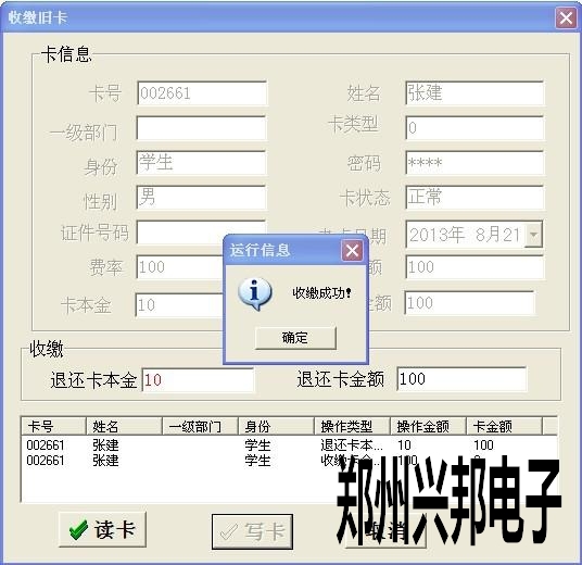 注銷卡就是收繳過的舊卡點(diǎn)擊【讀卡】出現(xiàn)卡片的基本信息后點(diǎn)擊【寫卡】,提示收繳成功后點(diǎn)擊【確定】即可。對(duì)于不用的舊卡可以使用此功能進(jìn)行收繳,收繳一定要在數(shù)據(jù)采集完成之后進(jìn)行。