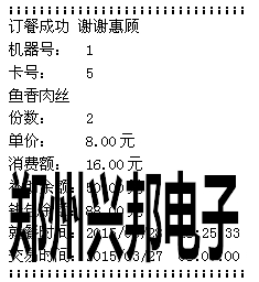 計算模式下按‘+’號鍵可進行取餐,取餐時將需要取餐的卡放到刷卡區(qū),消費機可自動讀取卡片上的訂餐信息,并將其顯示出來,按‘+’號鍵可翻頁查看訂餐信息,按‘確認’可進行取餐,取餐成功后會顯示就餐成功、菜肴名稱、份數(shù)、扣費金額,若連接的有打印機,可打印取餐信息,打印的格式如下圖所示:
