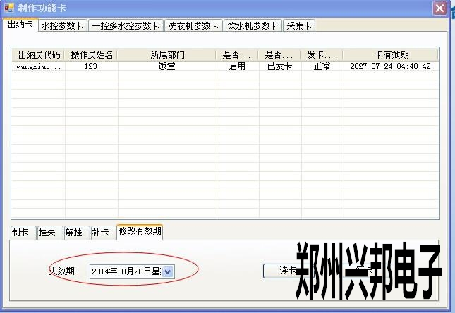 [文章內(nèi)容簡介]:IC卡食堂售飯機一卡通軟件,客戶在用一段時間后,再用出納員登錄,提示出納卡己過有效期。在出納卡這個界面你可以進(jìn)行制卡,掛失,解掛,補辦出納卡和修改出納卡的有效期