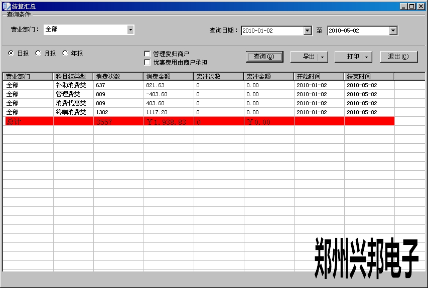 結算匯總表:查詢各營業(yè)部門日,月,年匯總報表,此表需要結算才能查看。窗口有兩個復選框架,如下圖所示:
