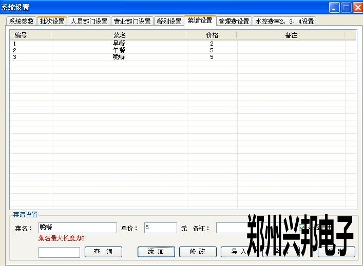 1、在軟件上先添加一下早中晚餐的金額。在系統(tǒng)設(shè)置里面的菜譜設(shè)置里設(shè)置是。