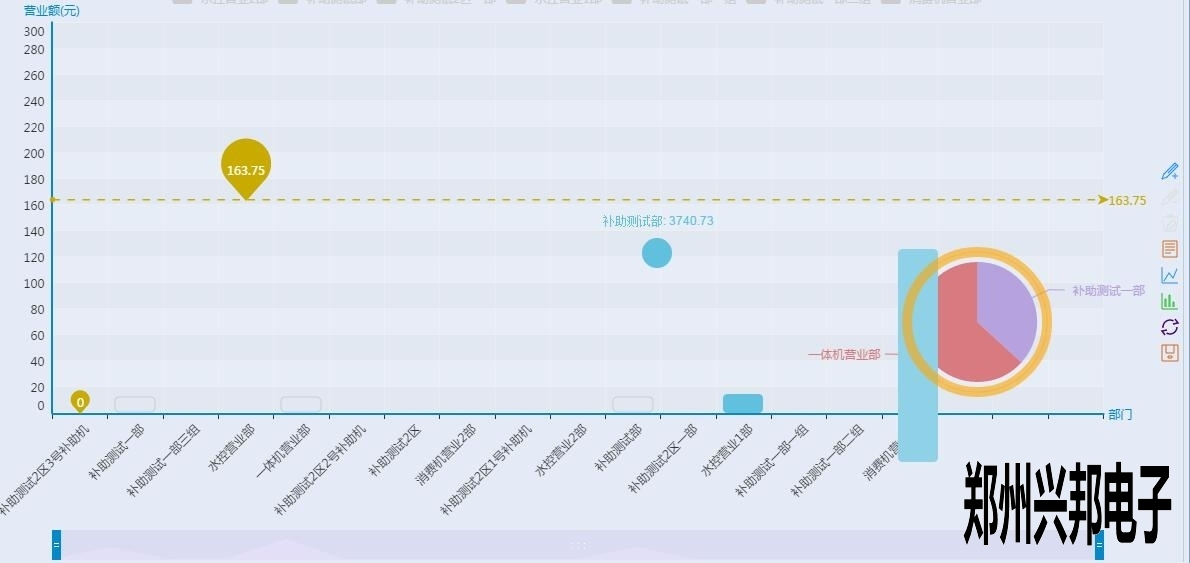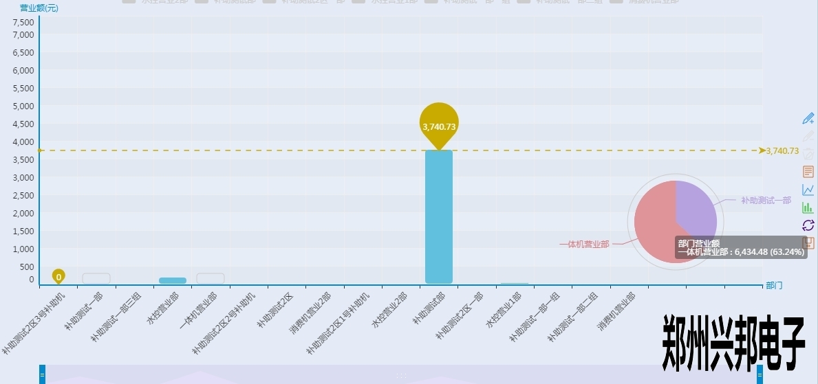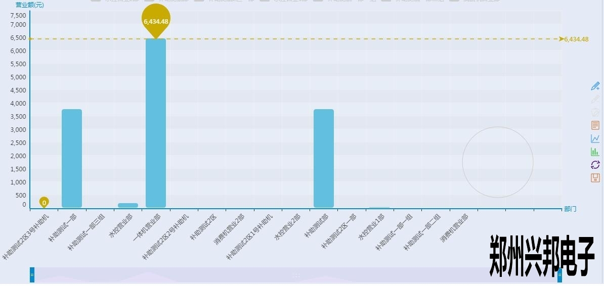 看上起跟終端營業(yè)圖表差不多,但是有沒有注意到有一根和終端營業(yè)分析圖不一樣樣色的虛線?這是這個圖表里面的最大值,也就是營業(yè)額最高的部門,當然下面的工具條也可以像終端營業(yè)分析圖一樣的滑動來看某個具體的柱圖,不過你又沒有注意到后面還有一個圈?對那是一個圈圈,有什么用呢?來看一下下面的圖形: