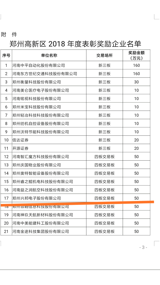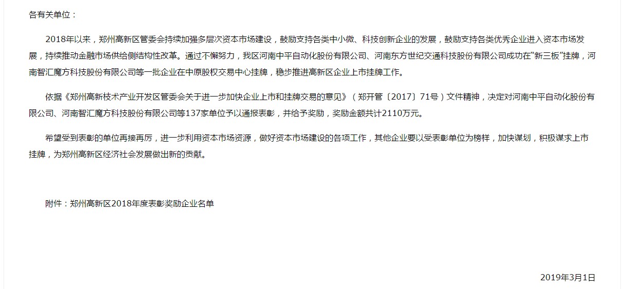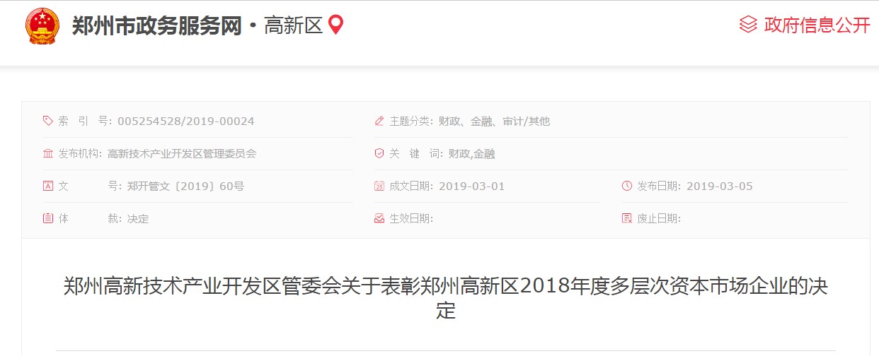 轉(zhuǎn)發(fā):鄭州高新技術(shù)產(chǎn)業(yè)開(kāi)發(fā)區(qū)管委會(huì)關(guān)于表彰鄭州高新區(qū)2018年度多層次資本市場(chǎng)企業(yè)的決定